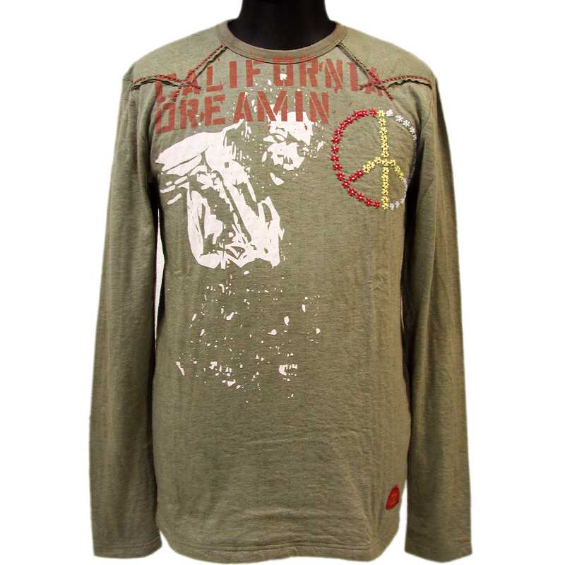●綿100% 生地表面は全体に小さく穴の開けられたデザインとなっており、 裏地の付いた若干厚手の長袖T-Shirt。 花の刺繍で作られたピースマーク、ジミヘンのプリントや色遣いなど、 70年代を彷彿とさせるヴィンテージ風なデザインに驚愕! |